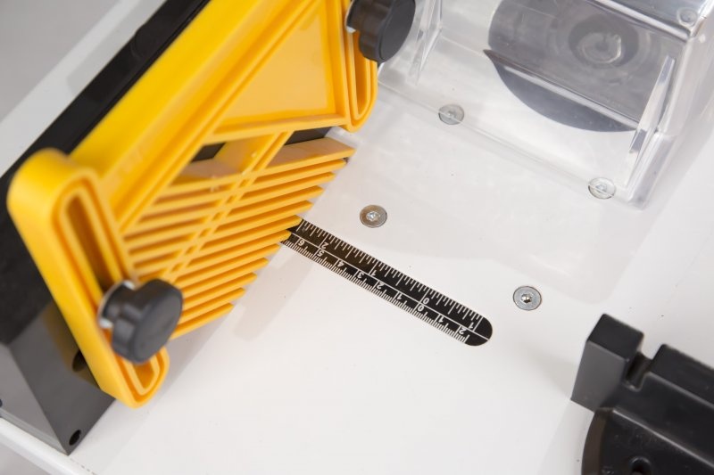 - An adjustable pressed steel and plastic fence, both vertical and horizontal pressure plates sprung for enhanced material support, a mitre fence, and a substantial table bed measuring 597mm x 457mm provide for ease of use and maximum operator safety.