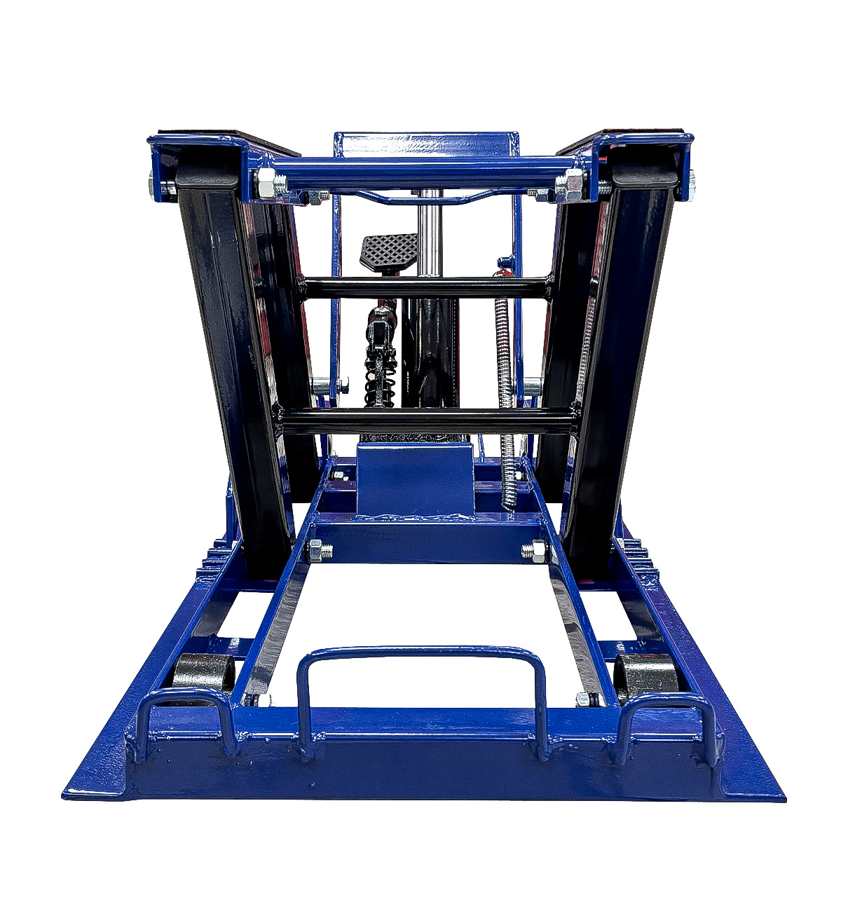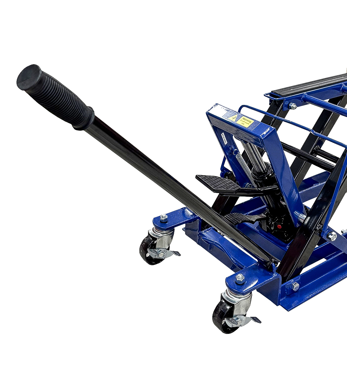 - Het bedienen van deze motorfietslift is eenvoudig. Plaats de bovenste voetplaat om het voertuig omhoog te brengen en zet het vast met de veiligheidsvergrendeling. Om het voertuig te laten zakken, drukt u eenvoudigweg de onderste voetplaat in.